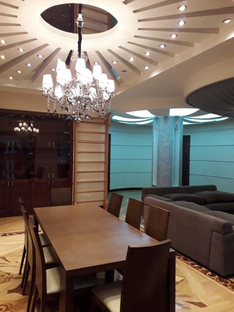 This interesting option for rent was initially a four room flat that was converted into a three room flat, resulting in a very large living-room, a kitchen with some extra space for more cupboards and storage shelves, and even a separate small wardrobe room in the main bedroom. The location is quite central, with a metro station literally within 3 minutes walking distance, a multi-purpose stadium with a closed swimming-pool and tennis/football courts is situated some 15 minutes away, small grocery shops and cafes all around the area, as well as two large parks (a family amusement and a recreational) in about a 15 minutes stroll. Conveniently situated on the sixth floor of a nine storey building, this flat consists of three rooms and measures 180 square meters. The building, a well as its underground garage, can only be accessed through an enclosed back yard which has one gate and a security booth next to it, that allows no trespassing. In the mentioned garage there is a parking space that belongs to the owner of the flat, so you won’t have to bother with finding a place to park. There are both an elevator and conventional stairs. On entering the flat you step into a spacious, round entrance hall, which branches out three ways – to the right is a guest bathroom with a shower, to the left is the kitchen area and straight ahead is the living-room entrance. The latter has both a dining-area for guests with a large table and 8 chairs, as well as a relaxation zone with a sofa and a TV. The kids bedroom has a unique design and bed form. Overall a very good choice for a small family to live in, especially considering the convenience of having all the important amenities in a close vicinity.